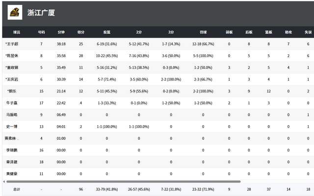广厦队5人得分上双,王子超25分8篮板7助攻,陈昱休28分5篮板,王庆岩14分4篮板,朝乐12分12篮板,童政钢11分5篮板4助攻。