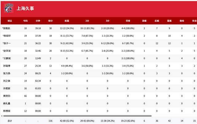 上海队打得确实好,命中率达到52.5%,而广厦队仅41.8%,差距明显。上海队5人得分上双,2人30+,张懿赵杰30分9篮板,张子一30分12篮板,赵羿澎20分5篮板,杨易轩18分10篮板4助攻,孙瑞博12分3篮板3助攻。