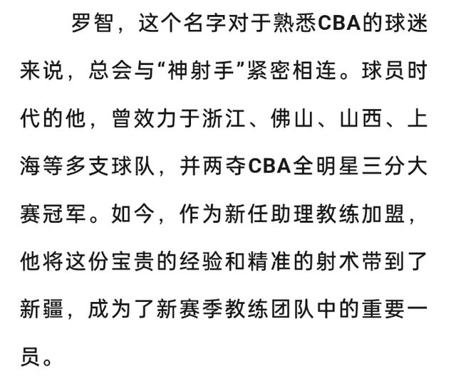 上赛季结束后,新疆男篮教练团队进行了一次大调整,除了保持主帅刘炜和老臣姜正秀,其他人都离队。在补充方面,本土教练有CBA名将罗智,经历了休赛期的考核之后,新疆男篮官方宣布罗智正式加盟球队,新赛季会负责刘炜,球队的目标是冲击前四。