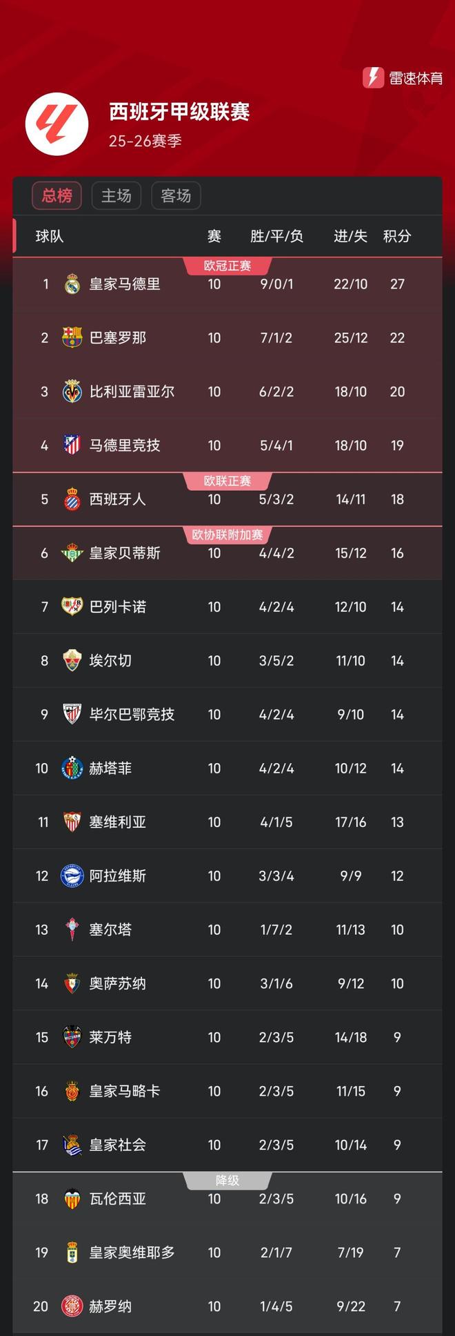 西甲第10轮后积分榜:皇马领先巴萨5分;黄潜第3马竞第4